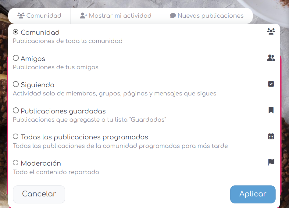 La primera opción "Comunidad" permite la selección de post que deseas ver en tu flujo de actividad, puedes seleccionar la opción que prefieres ver si deseas limitar tu visibilidad de Post. Para usuarios la opción de "Moderación" no está disponible y Publicaciones programadas te mostrará solo tus post si tienes post programados.