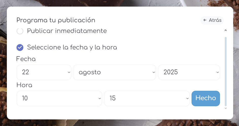 La opción Programar te permite programar tus post a una fecha y hora en especifico.